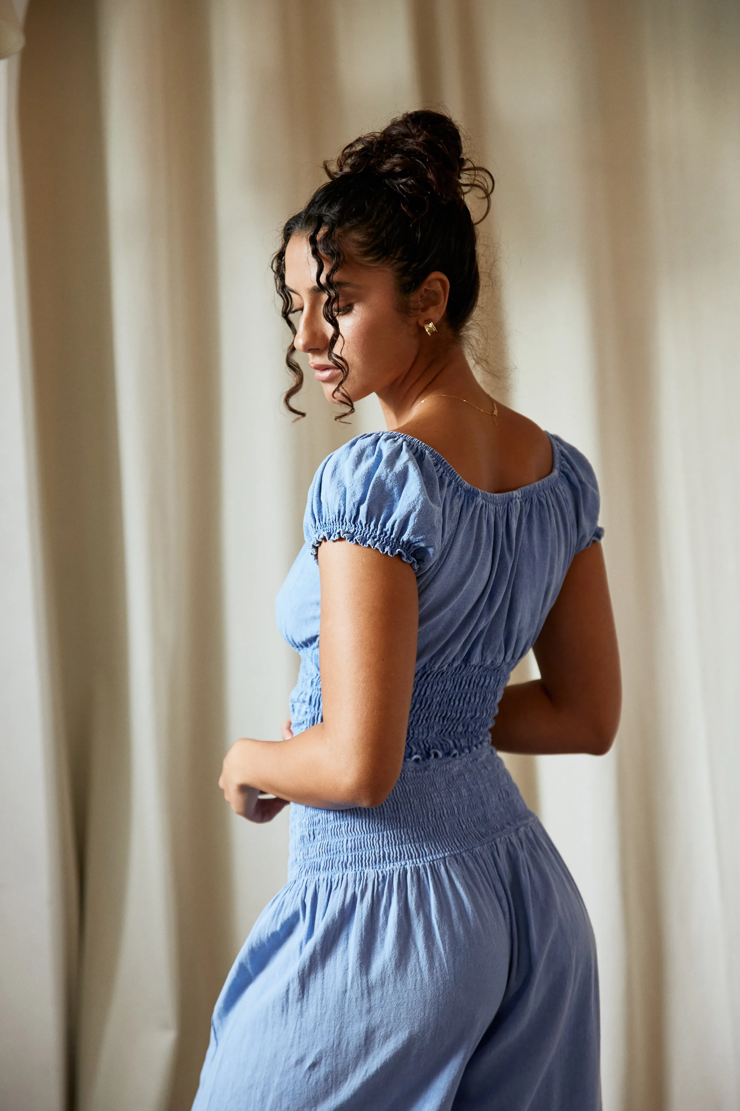 A crotchet staple! The Zia Top is made from a high quality cotton fabric. It is a slimming style featuring crotchet detailing, a beaded drawstring, and elastic panels across neckline, sleeves and waist. Complete the look with the Luli Pants.