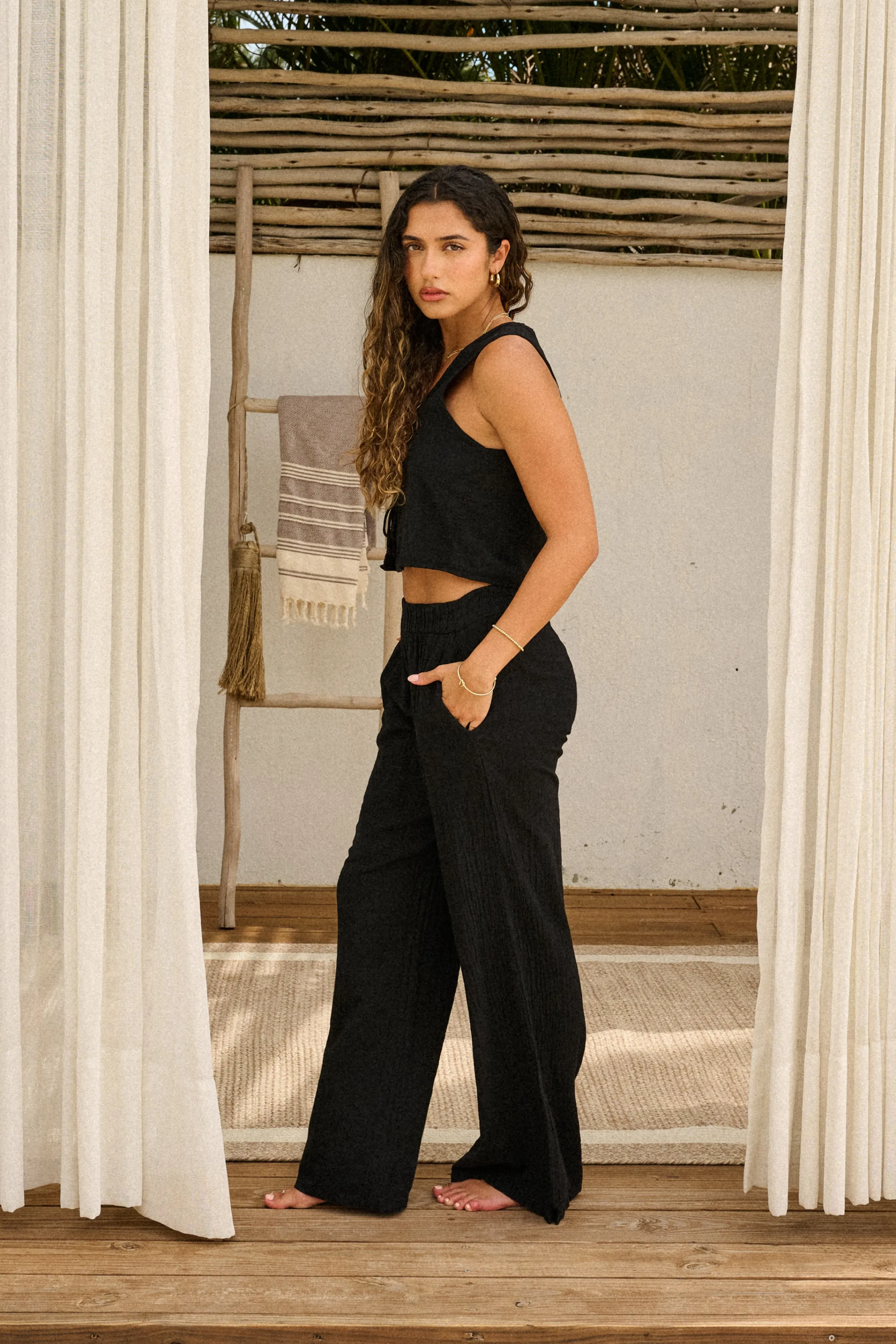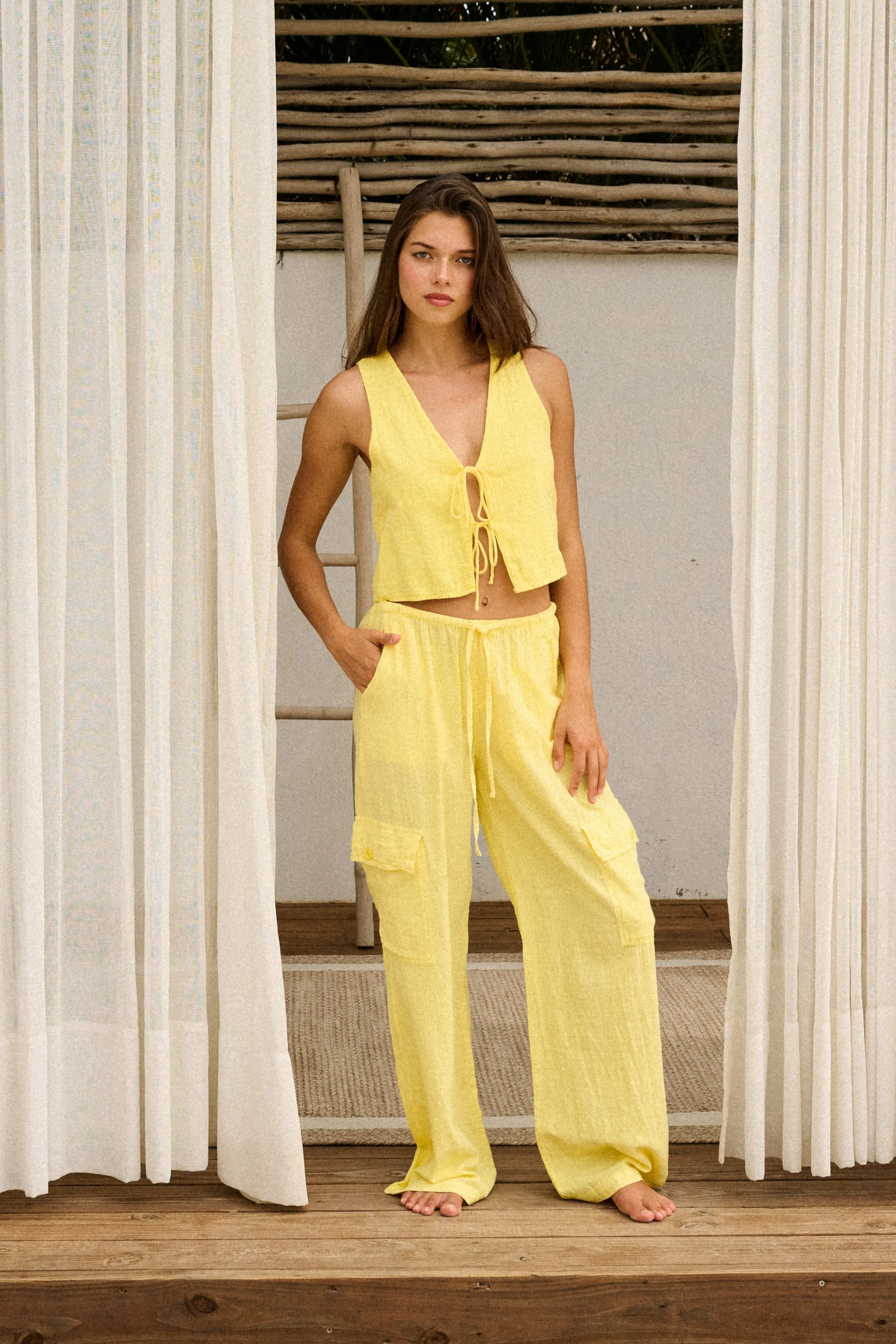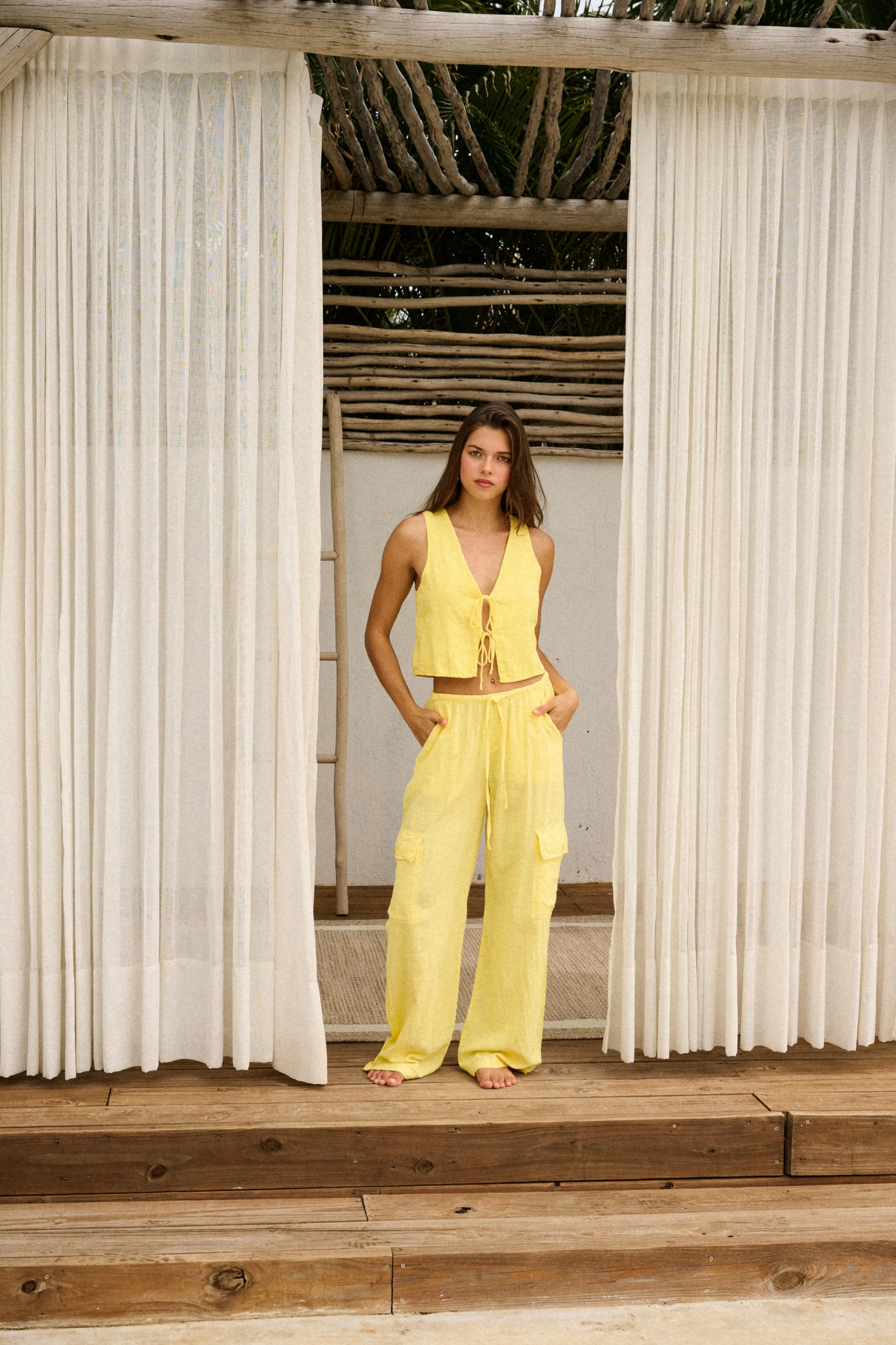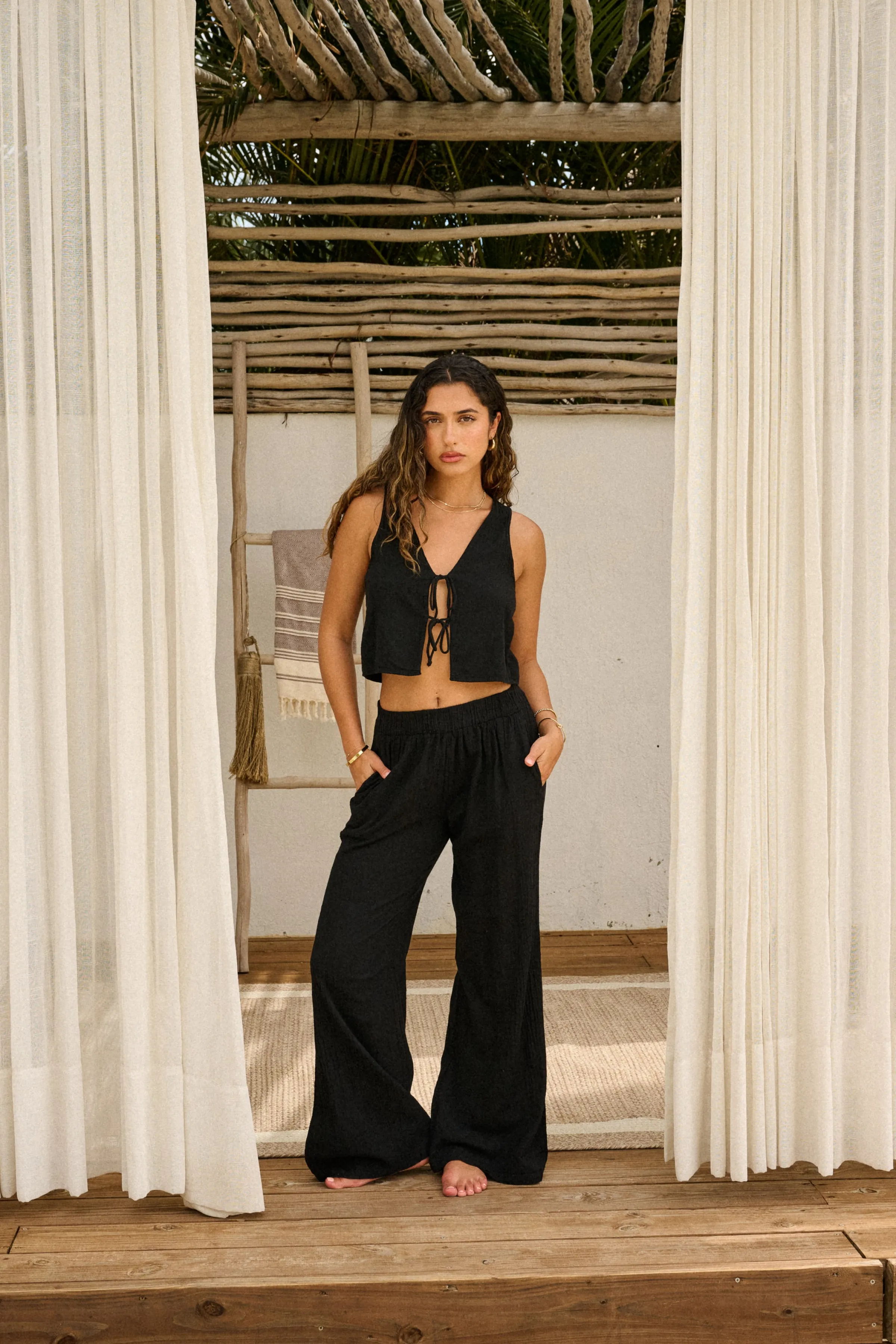 The Amara Vest features a lightweight, breathable design with a V-neckline and front tie closure. Perfect for warm days, it pairs effortlessly with wide-leg trousers for a chic, laid-back look.