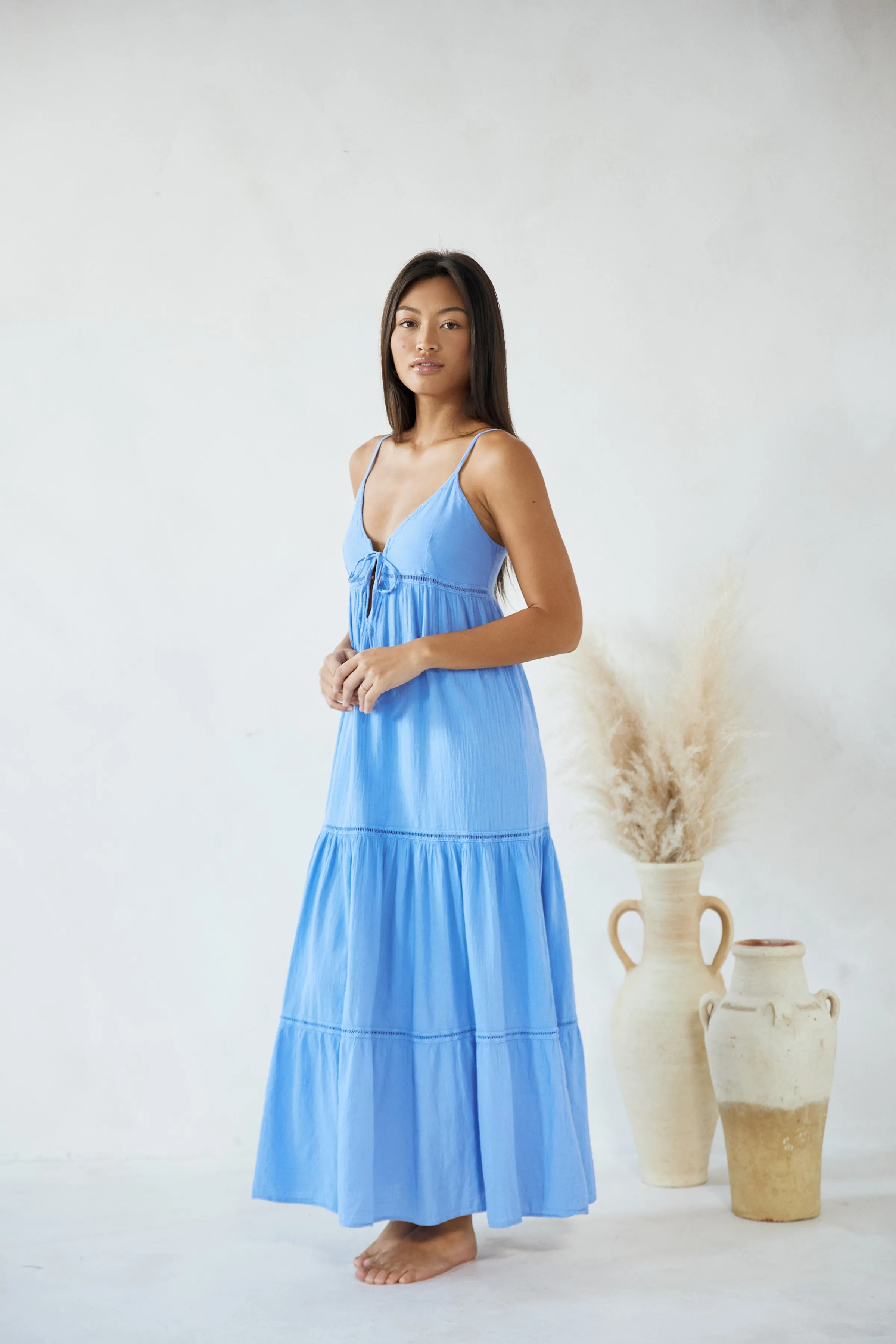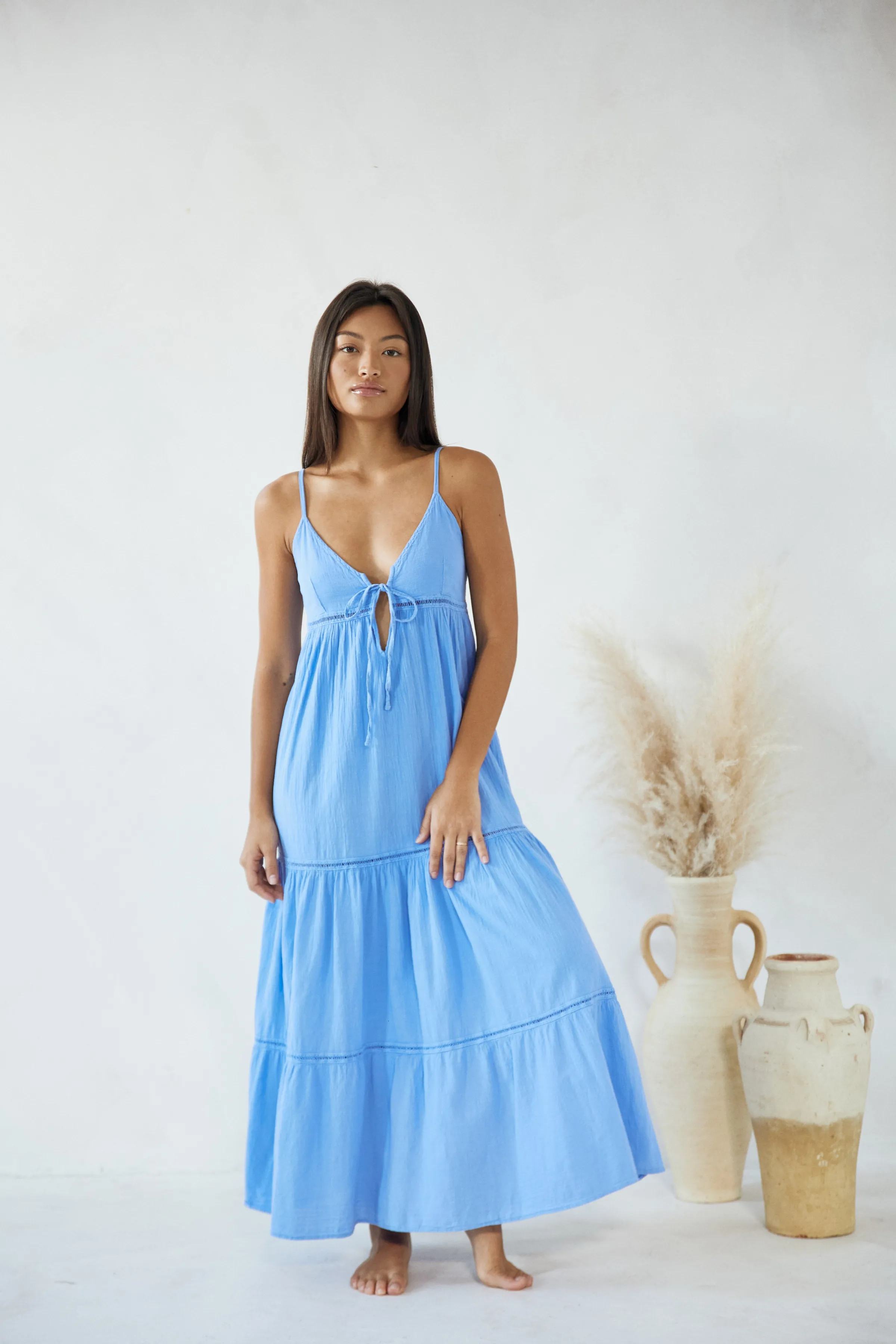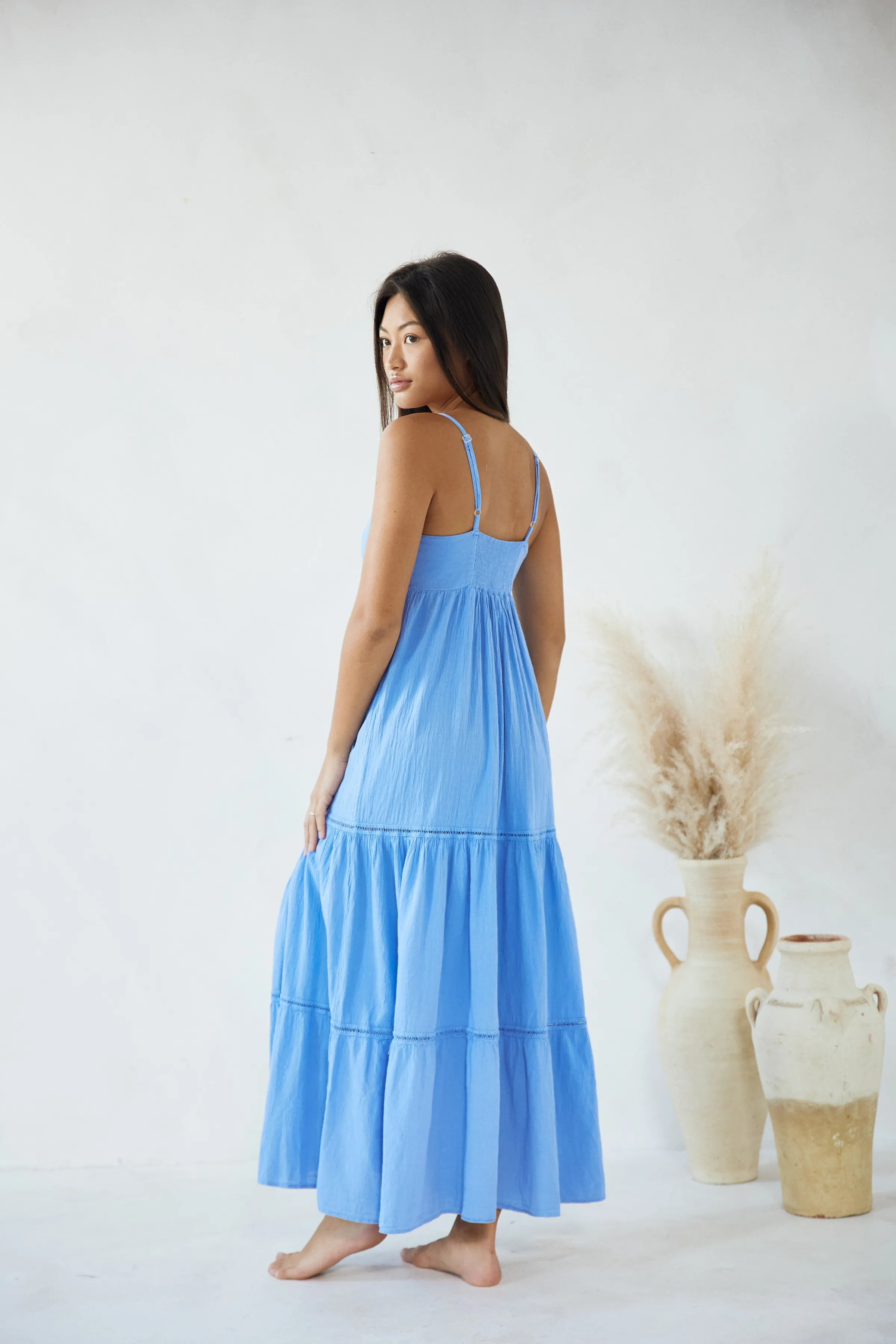 From beach to lunch! The Aneta Dress is made from a lightweight cotton fabric with a crochet detail. It is a flowy dress featuring adjustable straps and subtle crochet detail throughout. Pair with sandals for an effortless classy look.