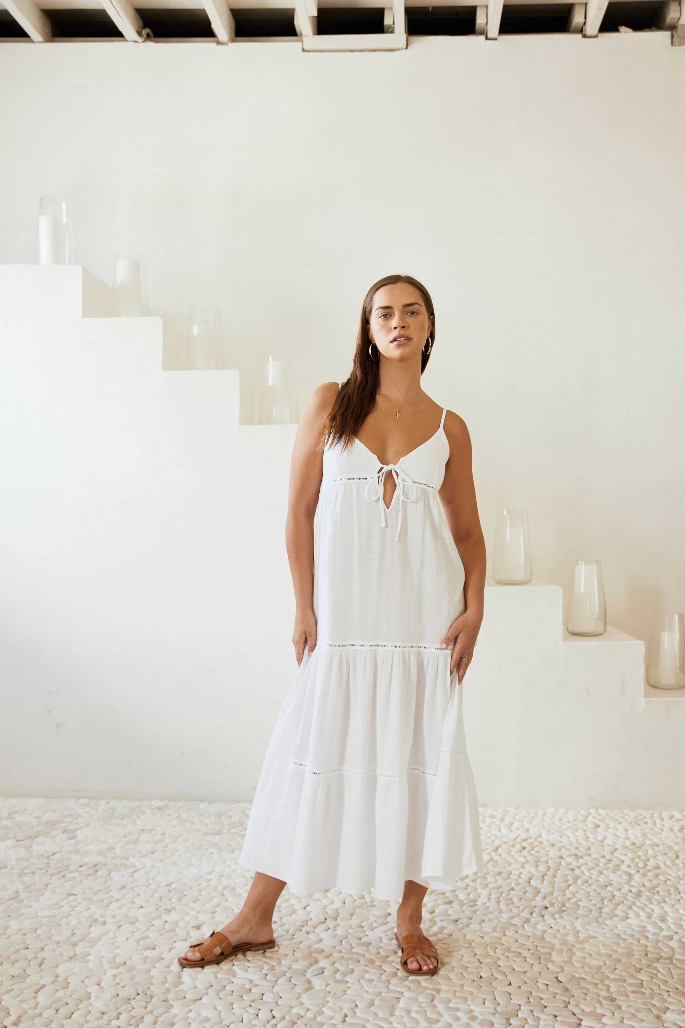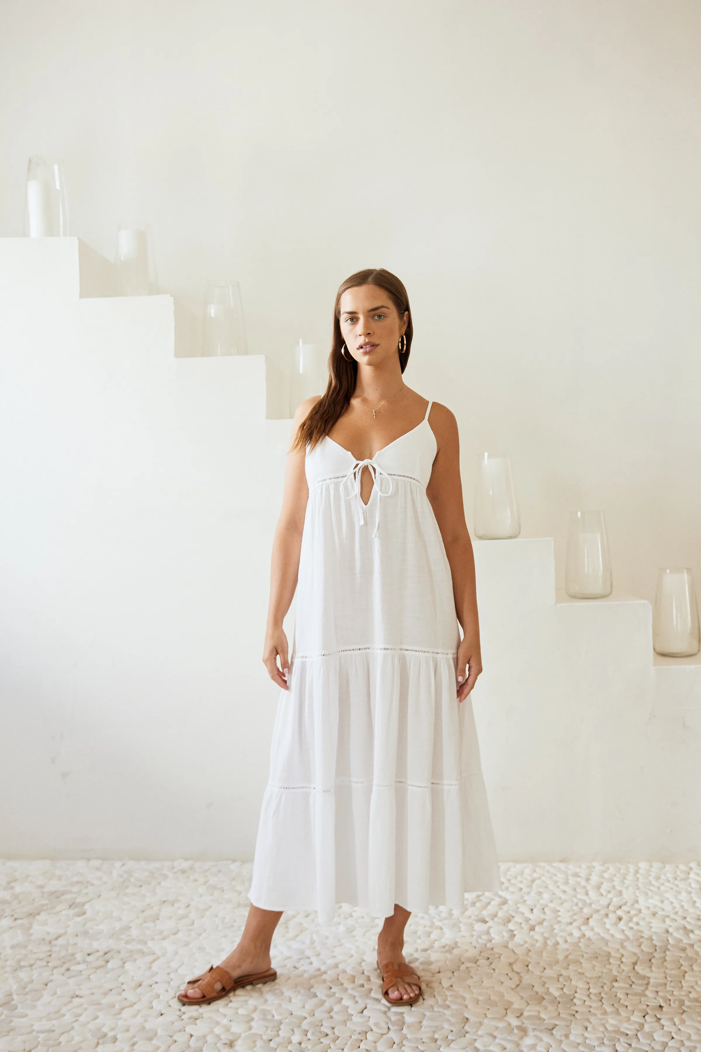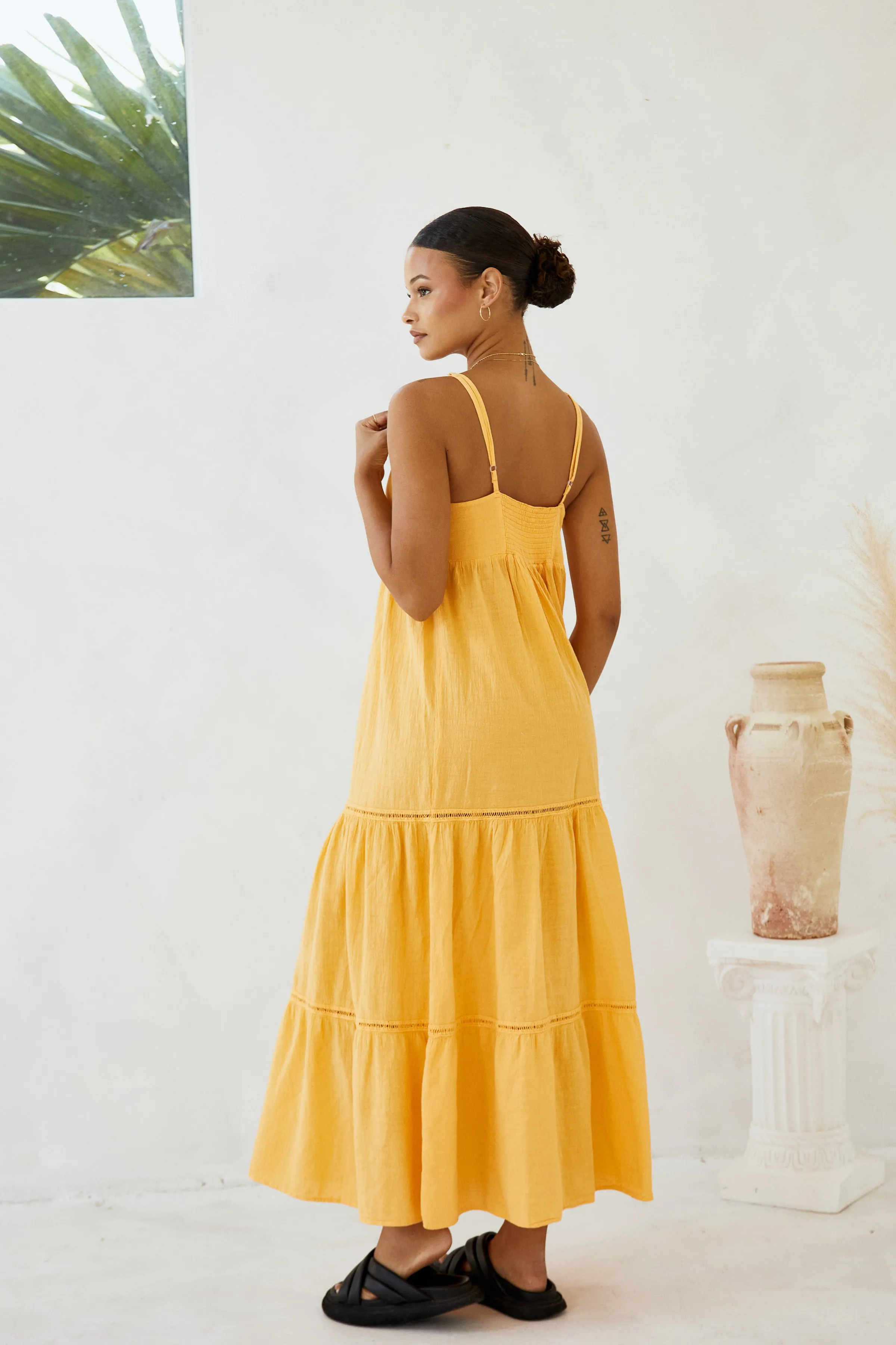 From beach to lunch! The Aneta Dress is made from a lightweight cotton fabric with a crochet detail. It is a flowy dress featuring adjustable straps and subtle crochet detail throughout. Pair with sandals for an effortless classy look.