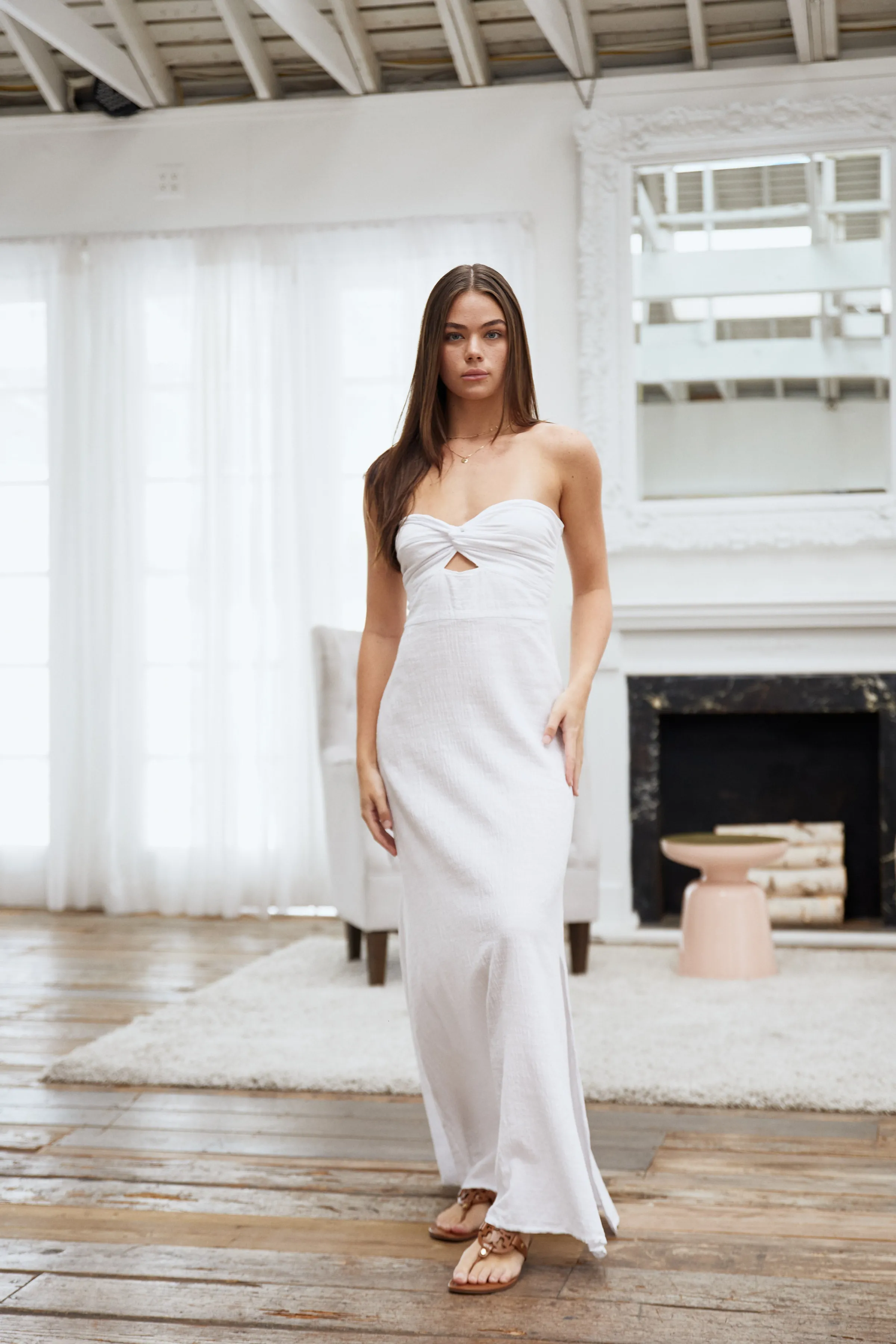 Scream elegance in our new Catalaya Dress, made from a high quality cotton fabric. It is a strapless piece featuring a twist front detail, flowy ankle grazing hem and split along the left side. Dress it up with heels or pair with flats for an effortless classy look!