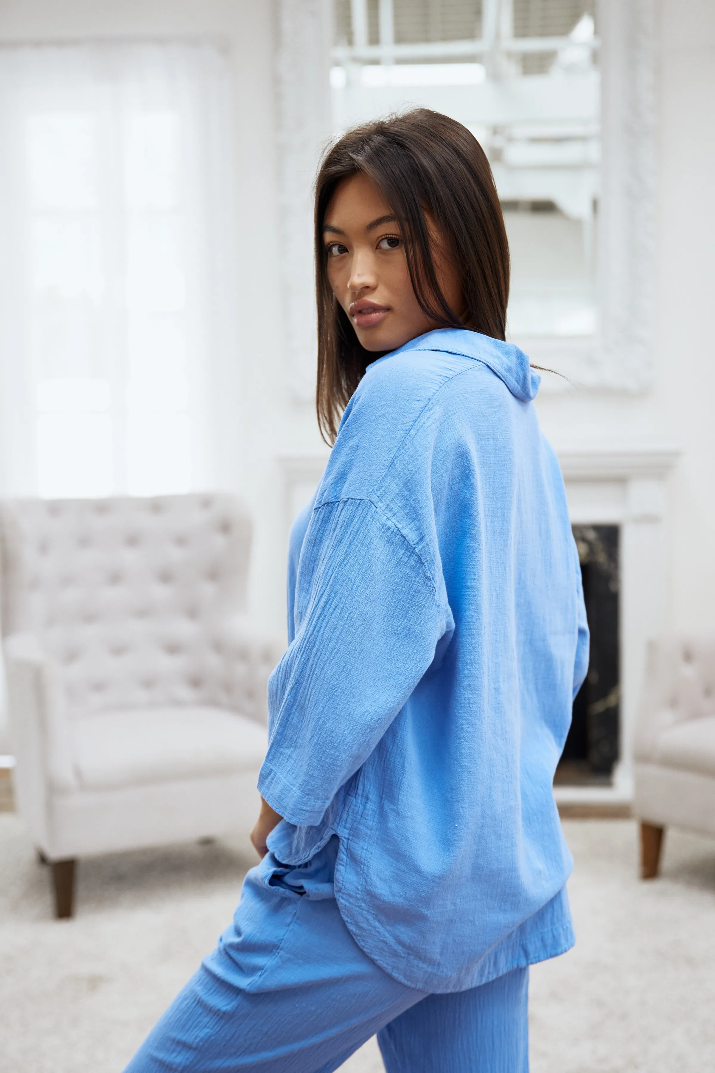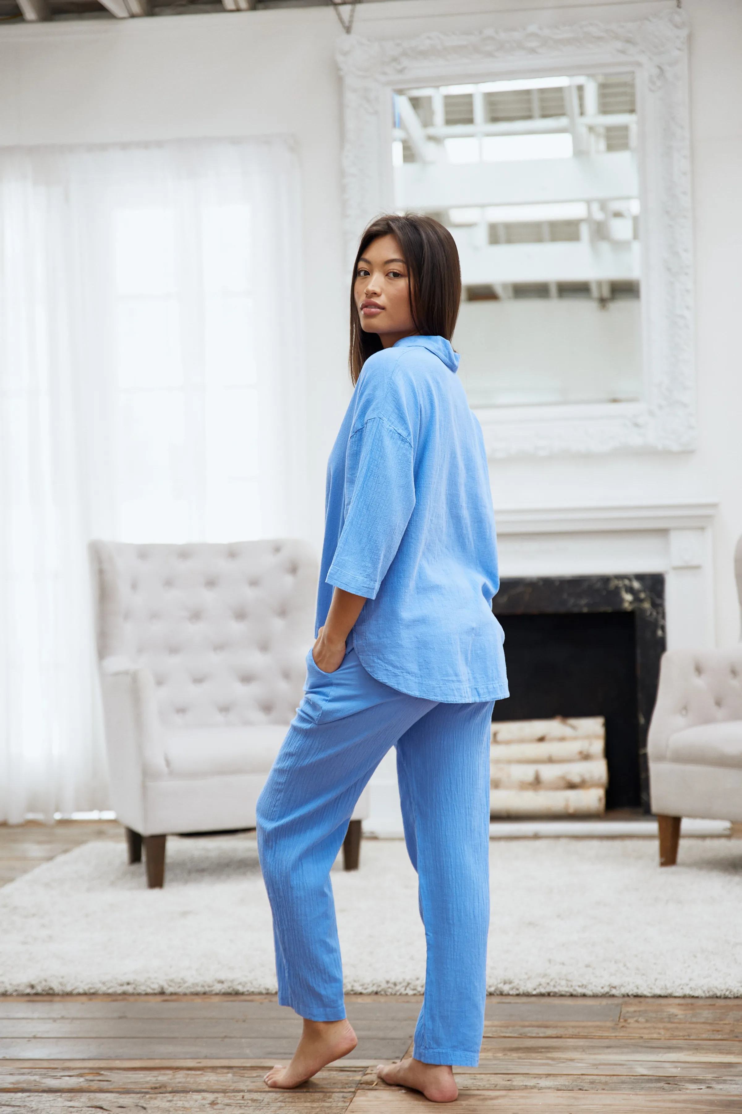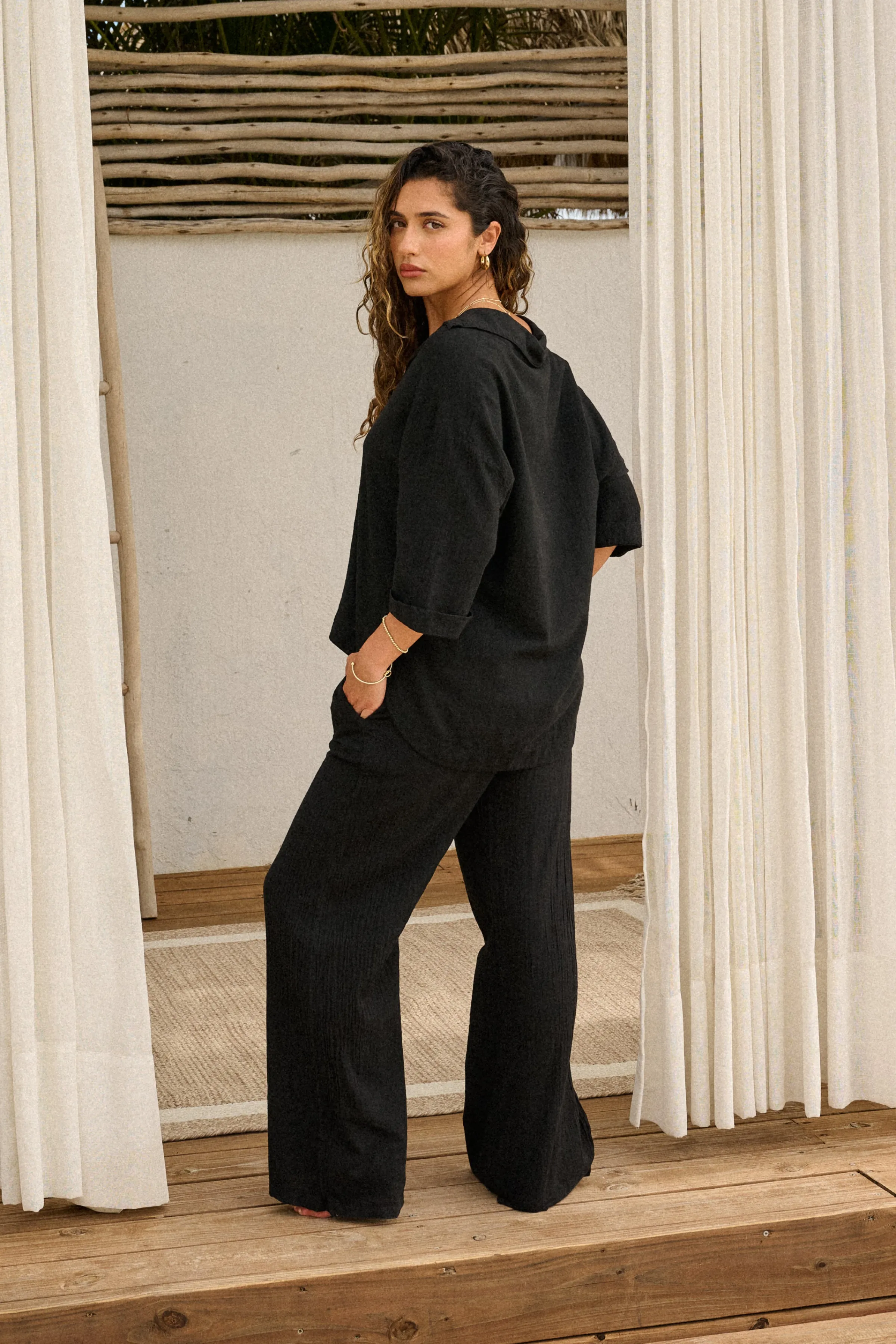 A versatile piece for your next vacation! The Harlow Top is made from a high quality cotton fabric. It is a relaxed fit featuring a deep V-neck, collar, and 3/4 sleeves. Complete this look with the Riza Pants.