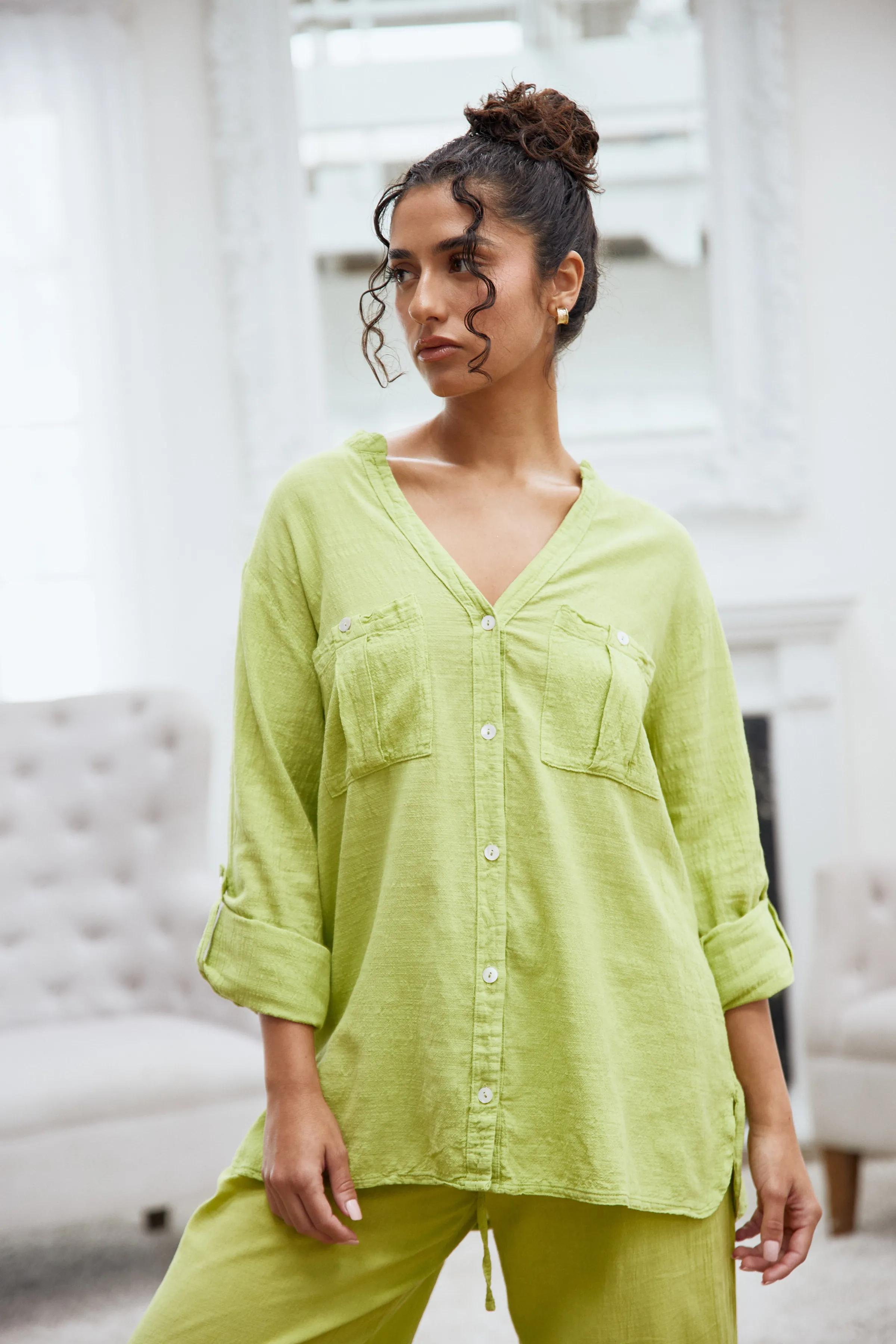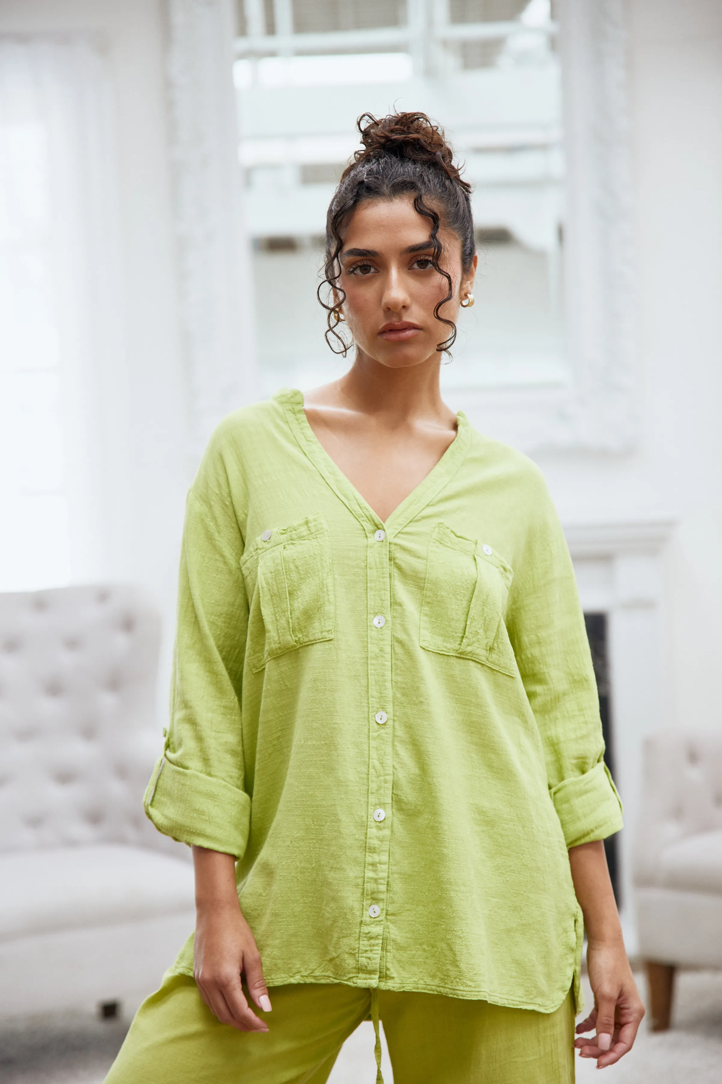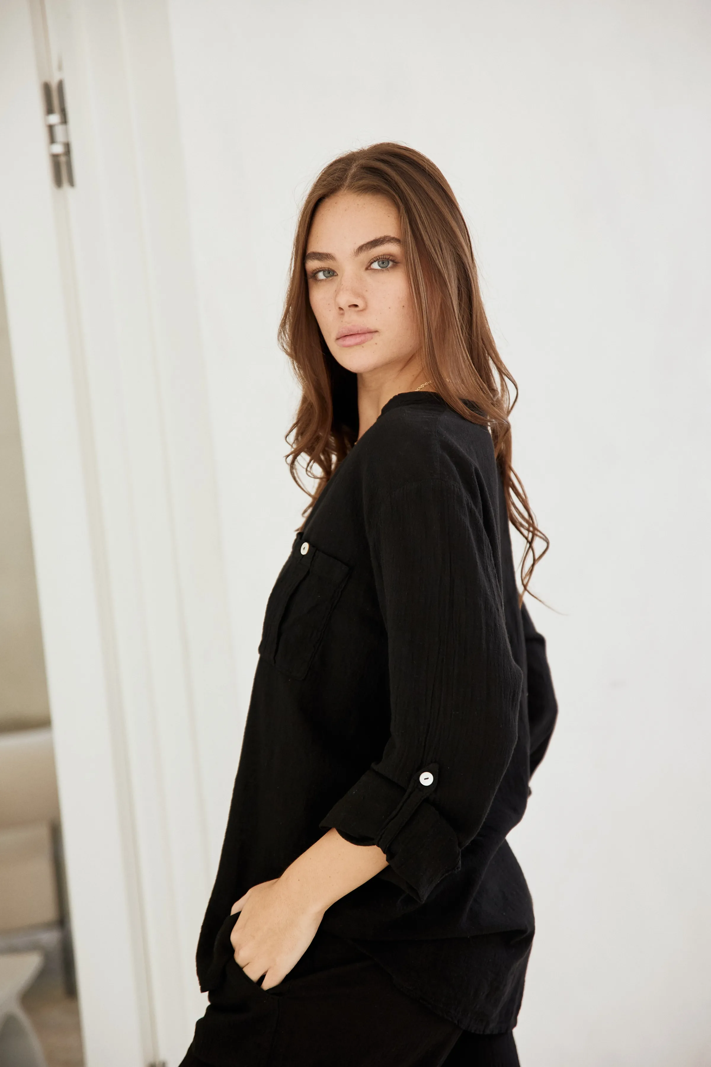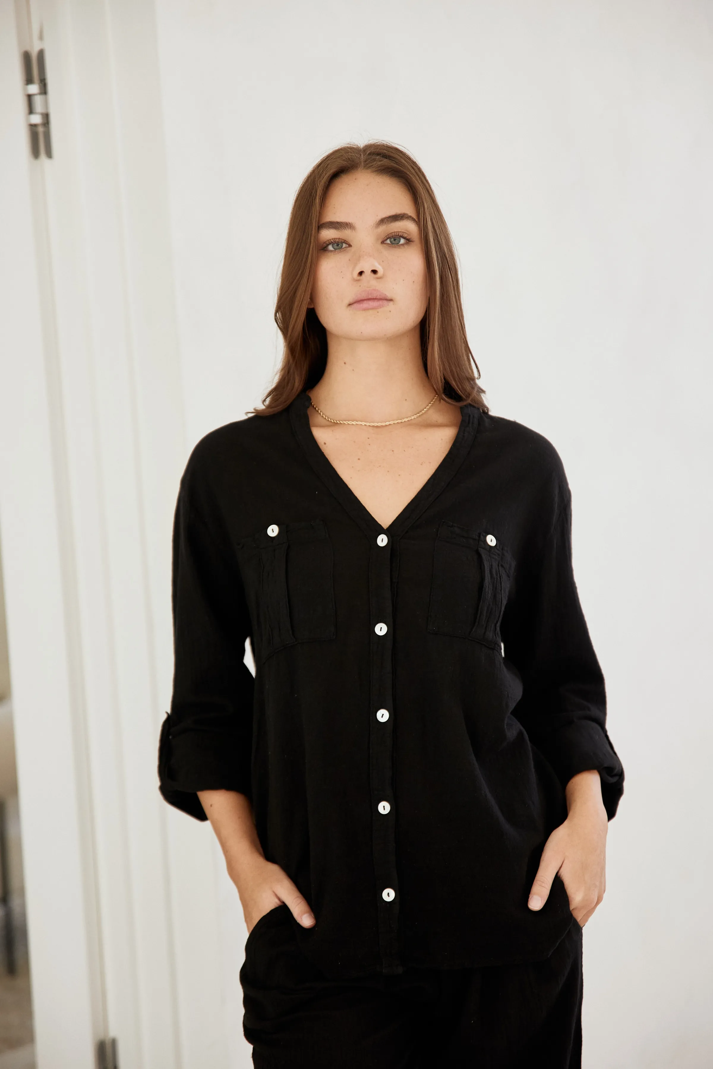Your everyday relaxed top that can be dressed up or down! The Noa Top is made from a high-quality cotton fabric. It is a loose-fitting style designed with pockets and centre front and sleeve buttons. Styled best with our Chiara or Dasha Pants.