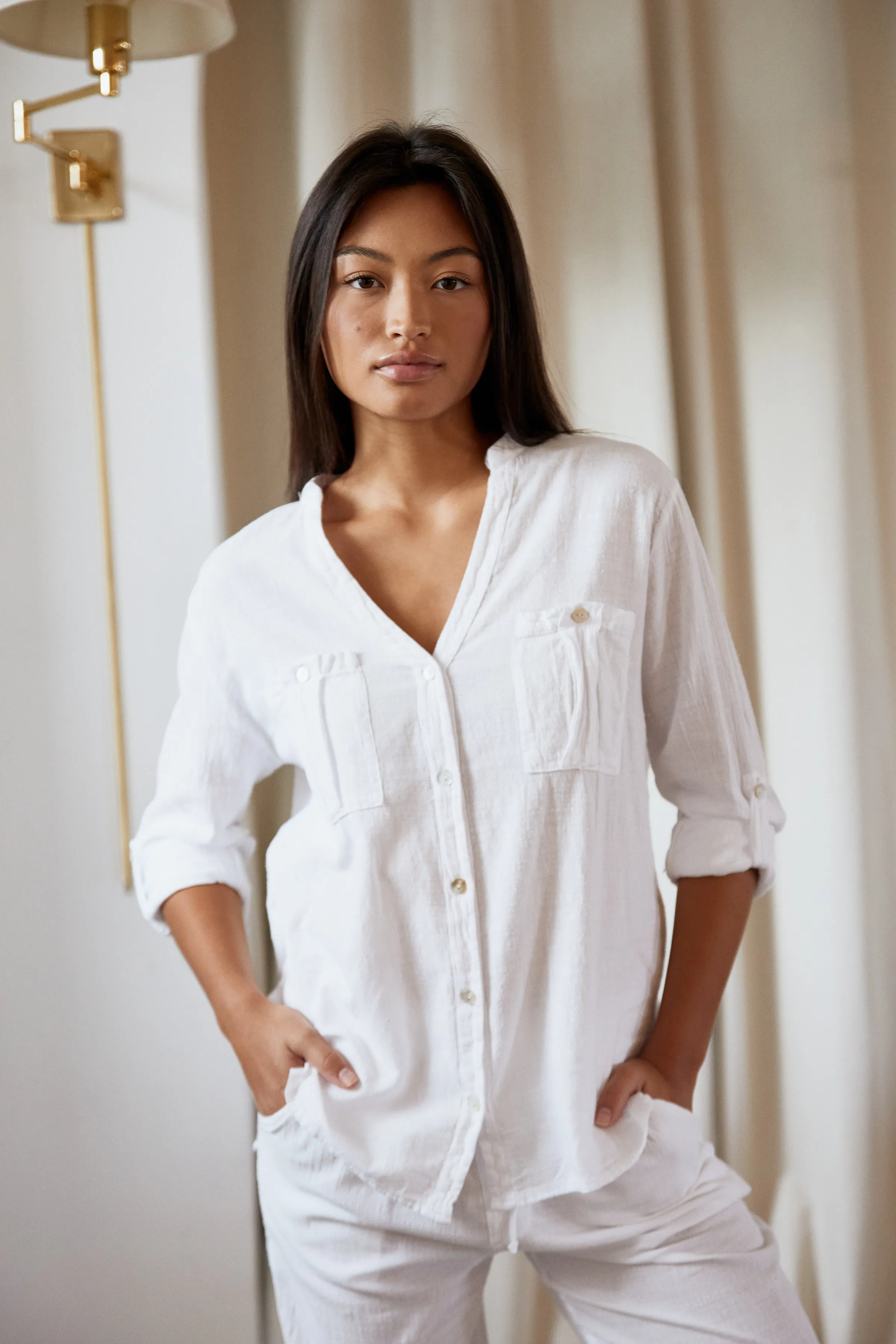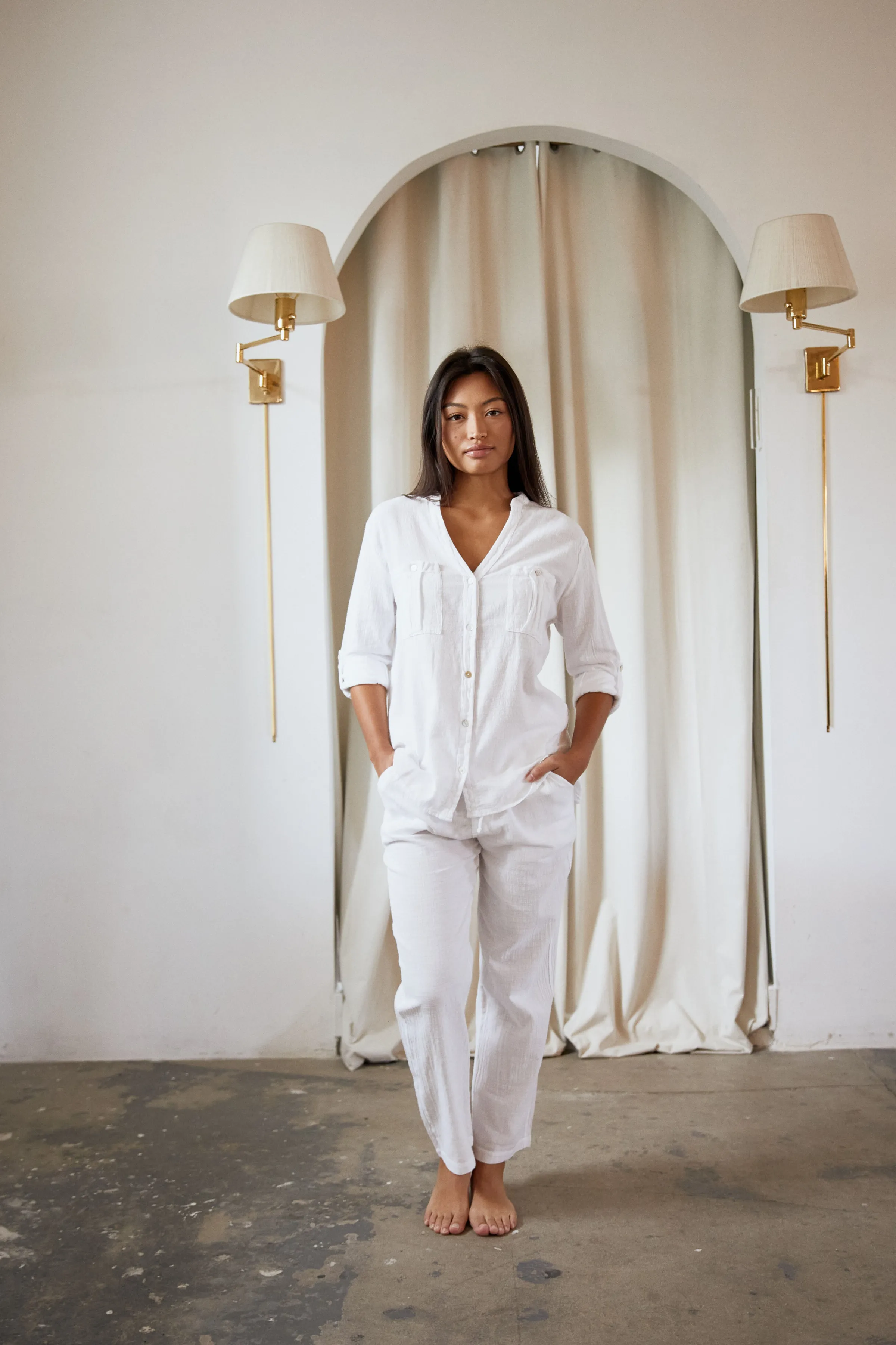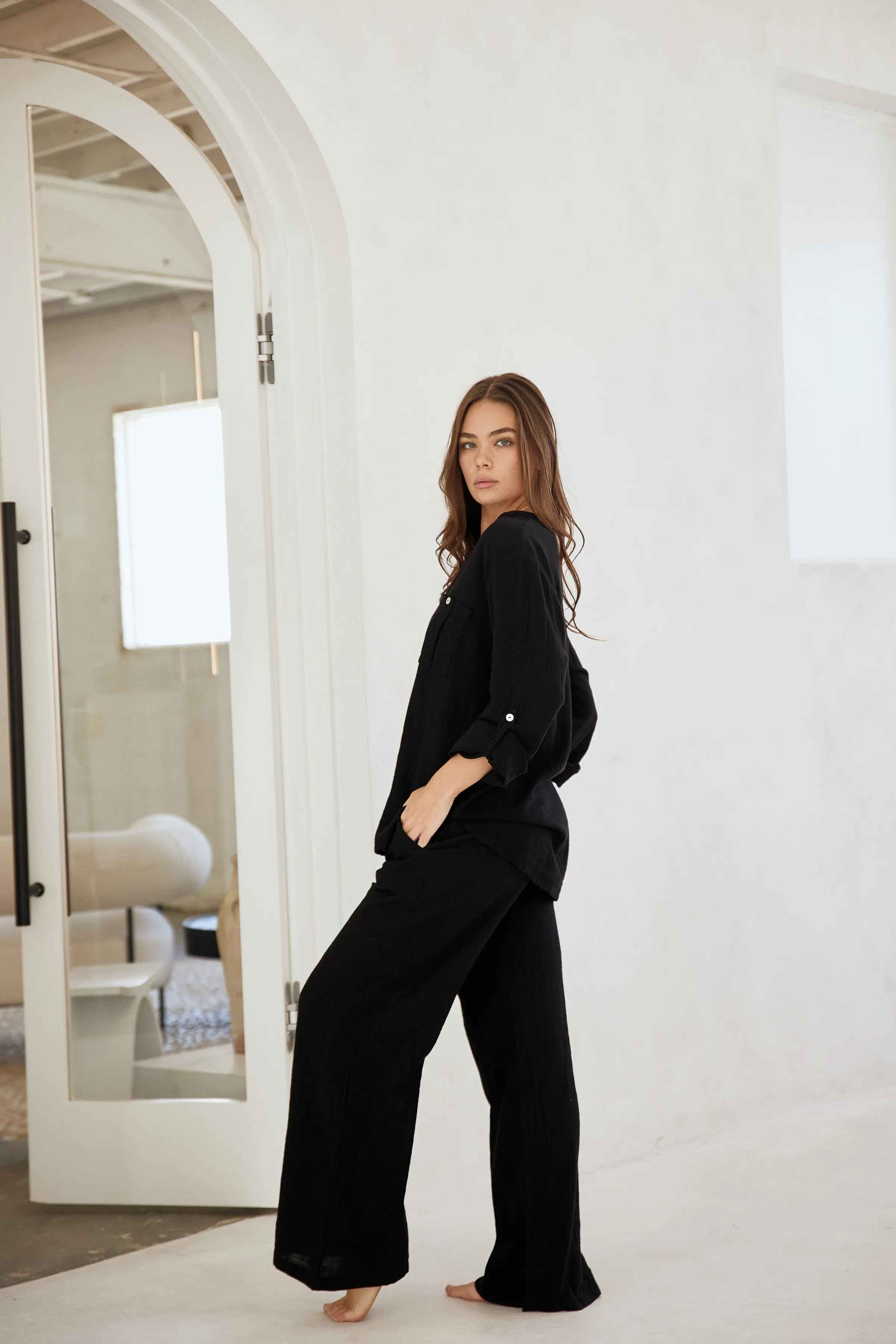 Your everyday relaxed top that can be dressed up or down! The Noa Top is made from a high-quality cotton fabric. It is a loose-fitting style designed with pockets and centre front and sleeve buttons. Styled best with our Chiara or Dasha Pants.