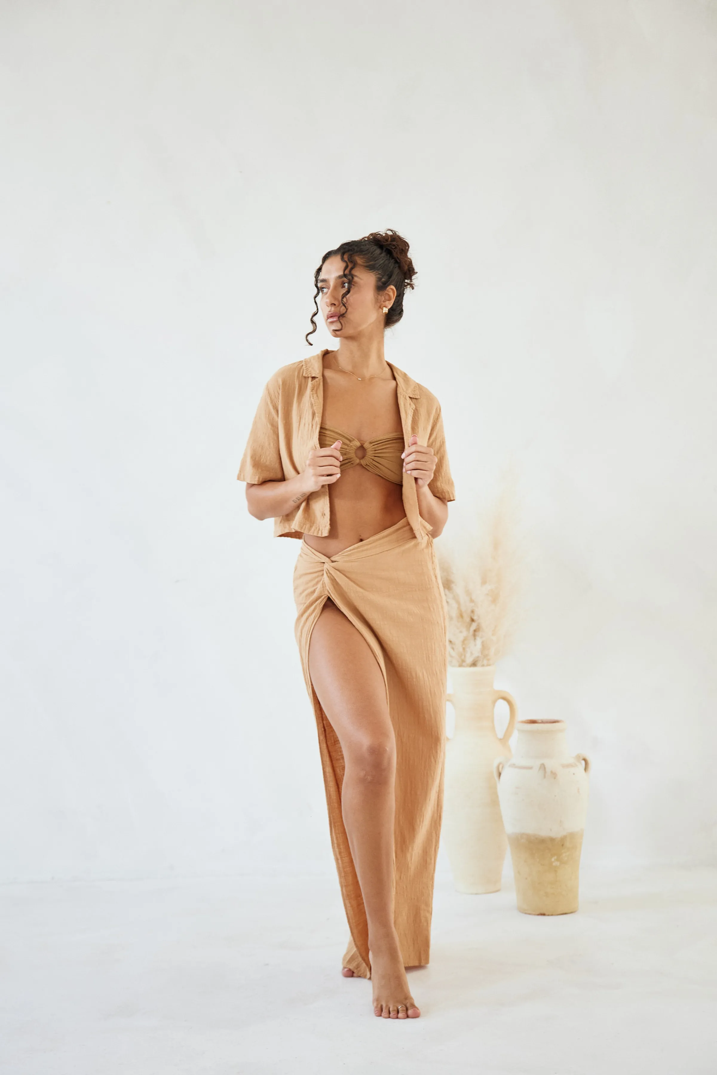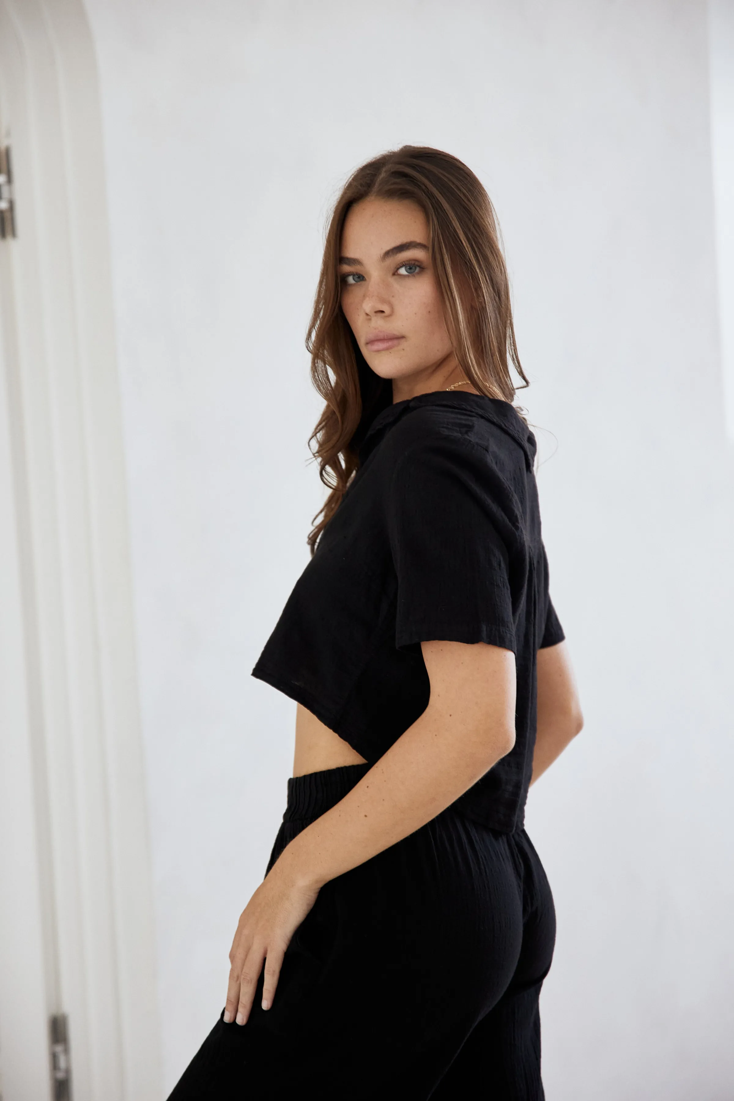 The perfect relaxed vacay top has arrived! The Rexa Crop Blazer is made from a high-quality cotton fabric. It is a loose-fitting boxy style featuring a collar, short sleeves and buttons on the front. Styled best as a set with the Chiara Pants.